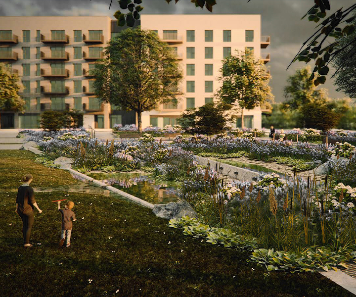 The landscape design proposal aims to integrate Nature-based Solutions by placing SuDS and Biodiversity at the heart of the design strategy, as well as complementary aims such as amenity, beauty, universal accessibility and play – all in line with New European Bauhaus principles. The urban design layout incorporates a variety of SuDS measures into the streetscape and open spaces which channel runoff to a central Urban Park Space. The Urban Park Space provides a range of robust amenities integrated within the urban centre, becoming its focal point.