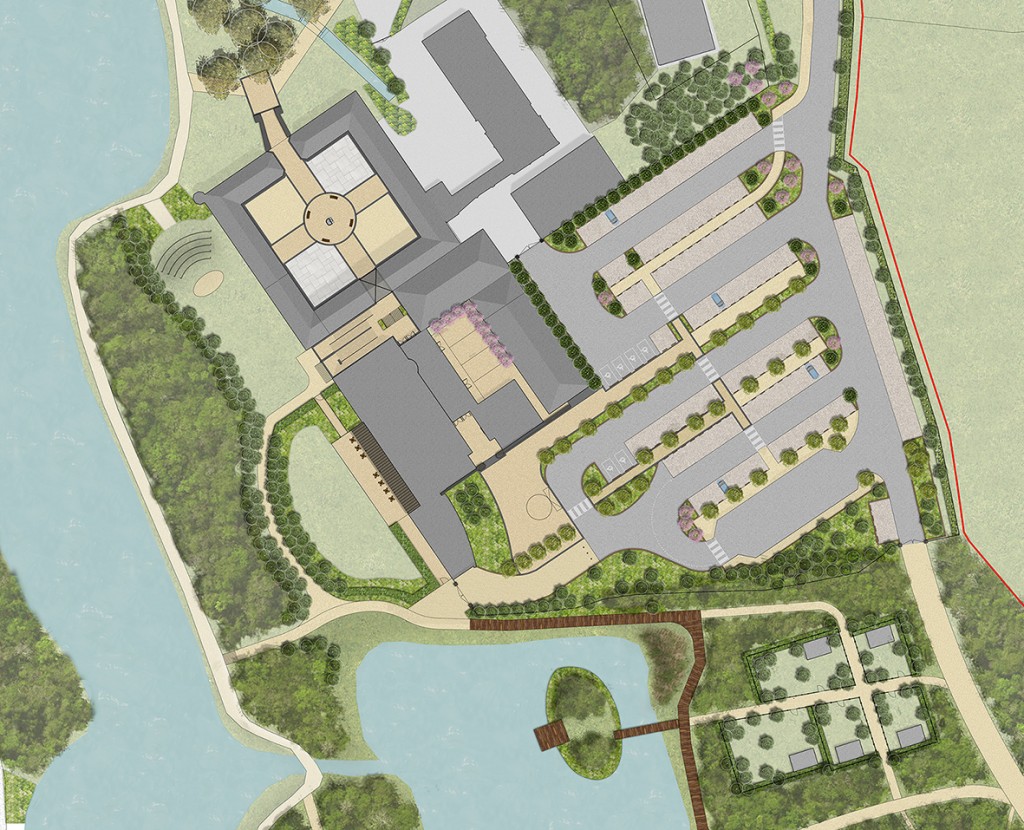 In landscape terms, the proposed development includes a variety of spaces and land uses proposed in parallel with the development of a new visitors centre and ancillary facilities, and the restoration and refurbishment works proposed to the castle.